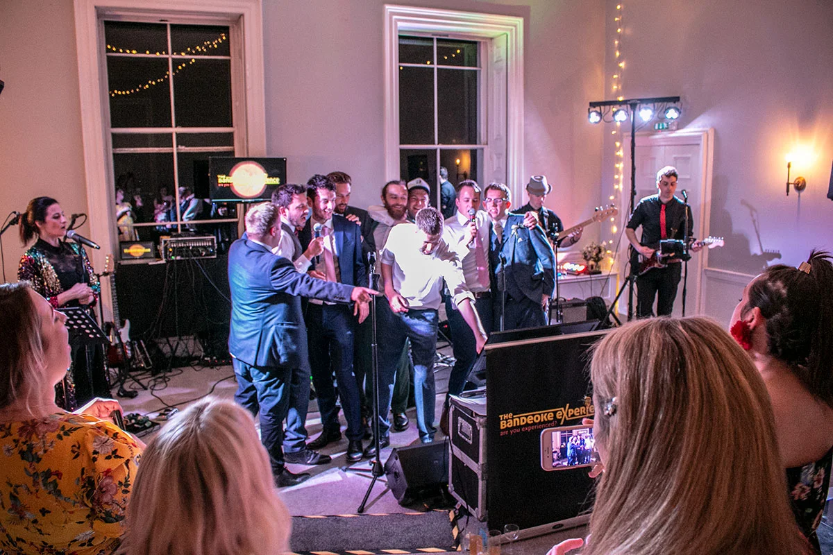 In the depths of the Kent countryside at the beautiful Oxon Hoath with glorious rustic views across the estate, we set to put on our live band karaoke wedding show for Rosie & Phil. It was a smallish room, the acoustics were a challenge, but the results surpassed even our expectations in view of the room’s loudness and the fact the wedding was spread out over multiple rooms. But no problem - the mics and dance floor were full all night…