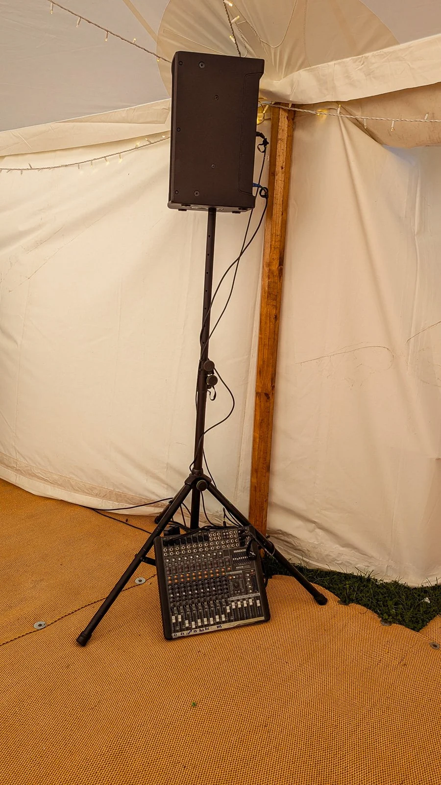 Earlier in the day, we also provided our speech mic service. A key detail here was speaker positioning: one high-quality speaker was placed to cover the main audience, with another positioned discreetly for the top table side of the marquee (see the gallery below). That helped the speeches feel clear and natural for the room, while avoiding awkward delays for the people actually speaking.