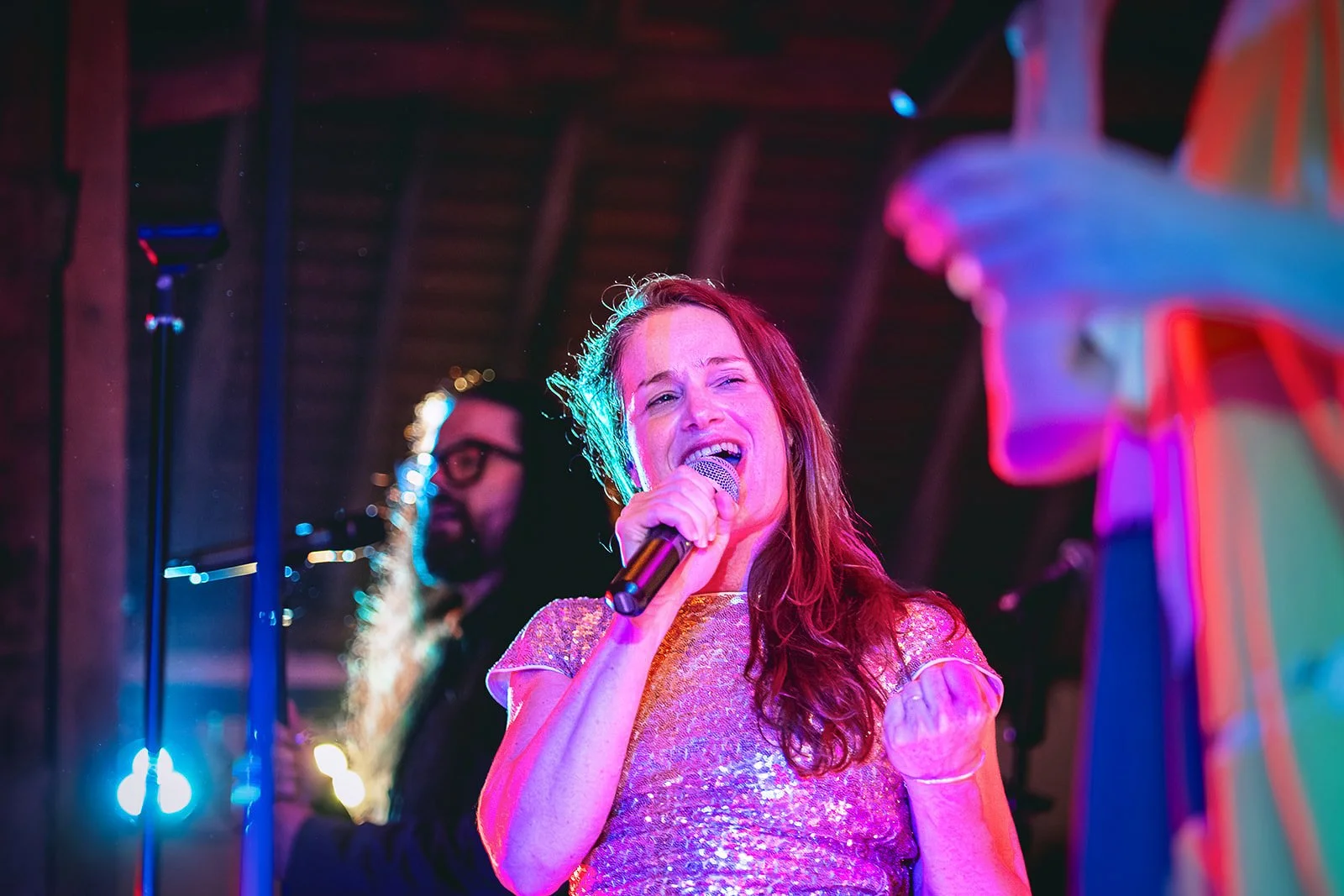 Set in The Old Barn at Pangdean Farm, this Brighton / Sussex celebration had that perfect barn-wedding vibe — warm, relaxed, and buzzing from the first note. We brought our 5-piece Bandeoke Experience for around 100 guests, and the venue team were brilliant: smooth load-in, great hospitality, and everything running beautifully.